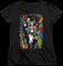 This womens Birds Of Prey shirt shows Harley Quinn, Black Canary, The Huntress, Renee Montoya, and Cassandra Cain posing in front of a colorful background.