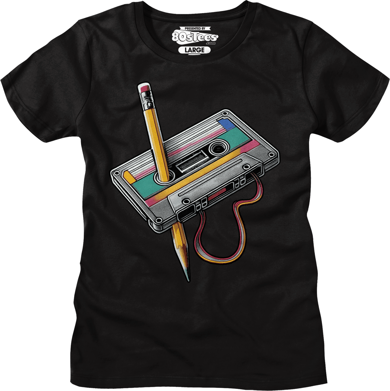 This 80sTees.com exclusive womens shirt shows a cassette tape being rewound with a pencil.