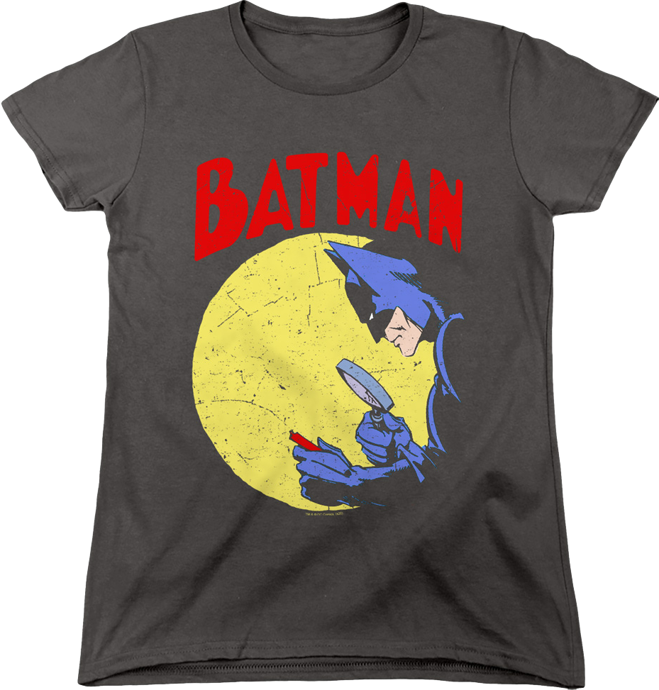 This womens Batman shirt shows the Caped Crusader using a magnifying glass and his detective skills to solve a crime in Gotham City.