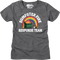 This womens 80sTees.com exclusive shirt shows a sparkling rainbow above a dumpster that is on fire. The shirt features a racoon that is a member of the highly trained Dumpster Fire Response Team.