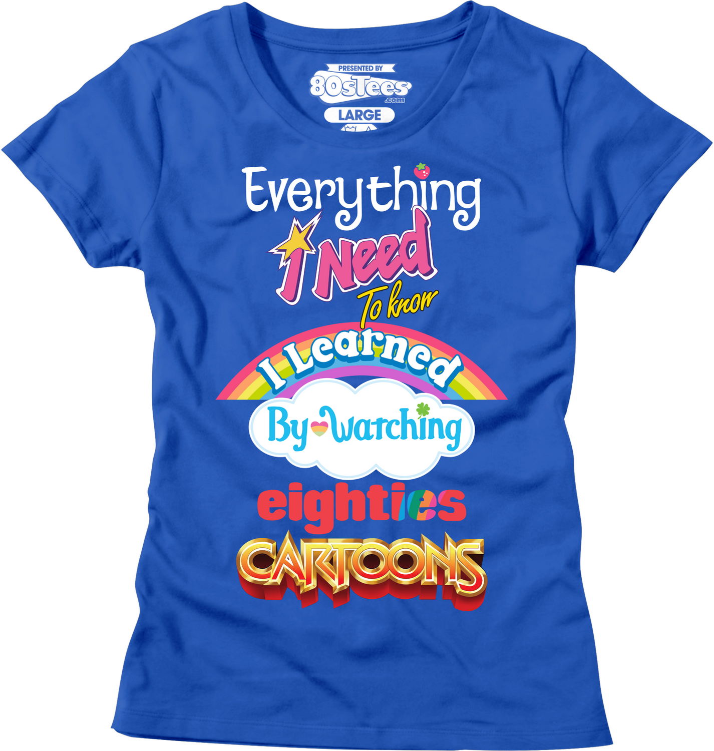 This womens shirt reads Everything I Need To Know I Learned By Watching Eighties Cartoons. The words are designed to look like the logos from your favorite cartoons, including Strawberry Shortcake, Jem and the Holograms, My Little Pony, Care Bears, Rainbow Brite and She-Ra.