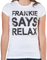 This womens Frankie Goes To Hollywood shirt features the print "Frankie Says Relax" on the front and "Don't Do It" on the back. This shirt was seen being worn by Mary Kate Olsen and it was fought over by Ross and Rachel during a bad break-up on an episode of "Friends".