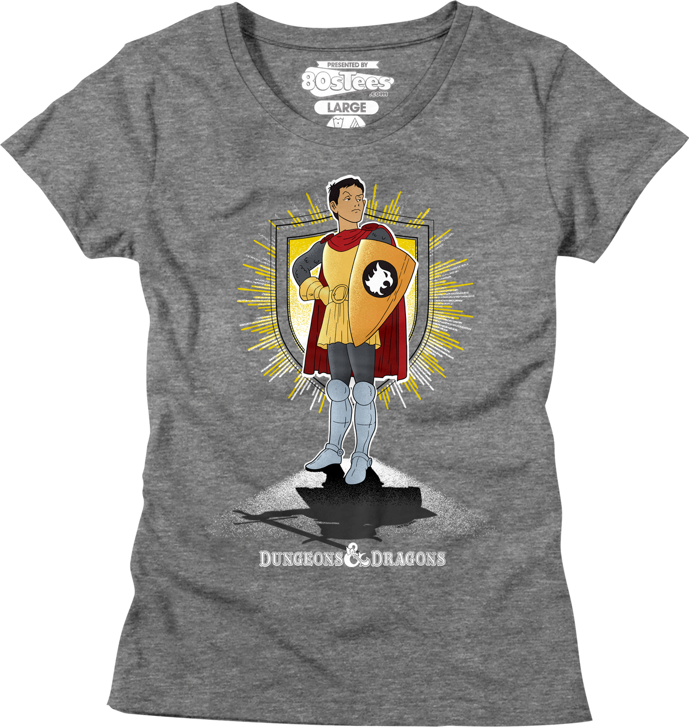 This 80sTees.com exclusive womens Dungeons & Dragons shirt features an image of Eric, the Cavalier posing with his magical shield.