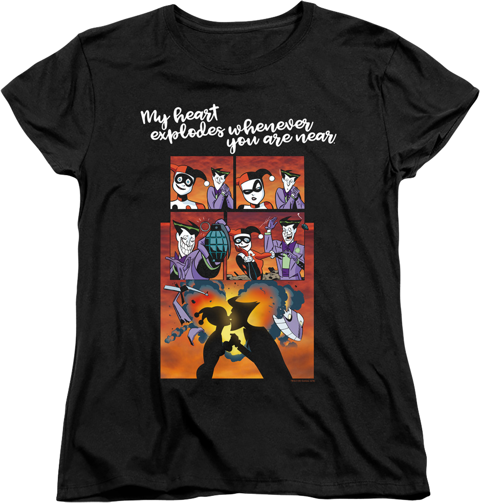 Womens Harley Quinn And The Joker Heart Explodes DC Comics Shirt