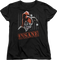 This Womens Insane Harley Quinn Shirt shows the clown princess of crime wearing her harlequin costume and make-up. She is stamped as "insane" with bars in the background and a terrifying expression on her face. The Joker's main squeeze has been exciting audiences since her debut in 1992. Before becoming Harley Quinn, Dr. Harleen Frances Quinzel worked at Arkham Asylum where she gained a boyfriend and lost her marbles.