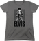 The King of Rock and Roll is pictured wearing black leather and singing into a microphone on this Womens Leather Suit Elvis Presley Shirt. The leather outfit became a signature look fro his '68 Comeback Special that aired live on December 3 and relaunched his career in music after spending years in the movie business. A picture taken during the performance was featured on a cover of Rolling Stone in 1969 and the performance has become one of his most iconic.