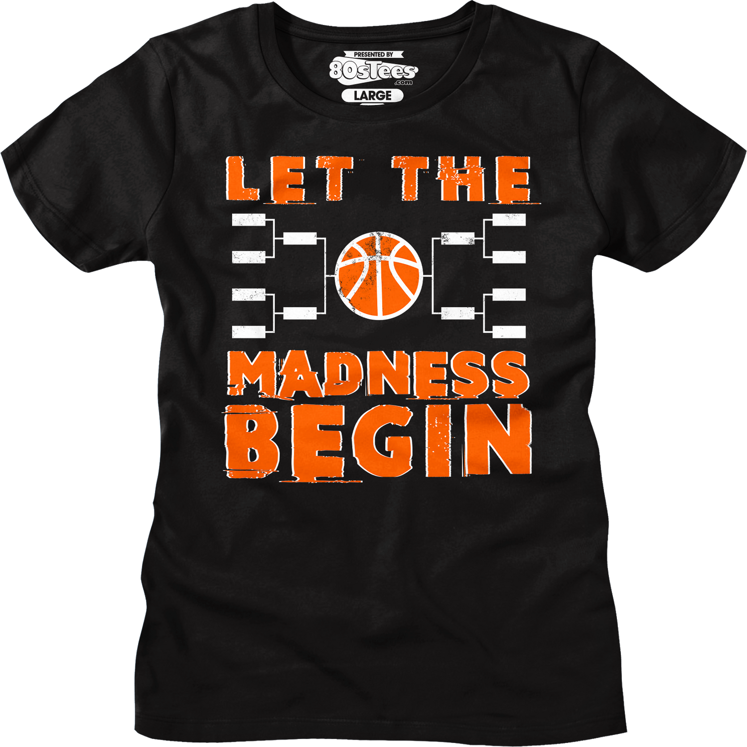 Everyone will immediately know you are a fan of the exciting tournament when you wear this 80sTees.com exclusive Womens Let The Madness Begin March Madness Shirt!