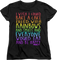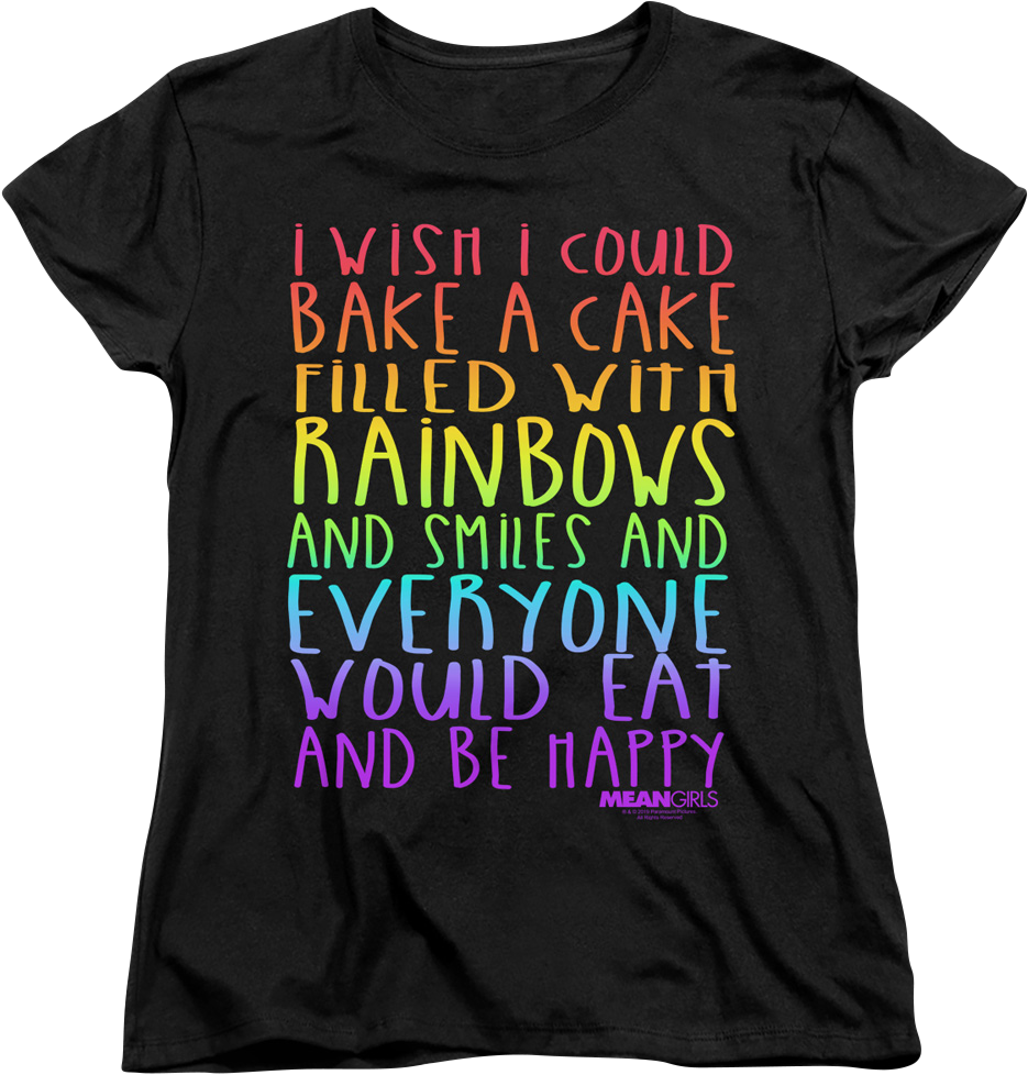 This women's Mean Girls shirt features one of the most memorable quotes from the 2004 movie, "I wish that I could bake a cake made out of rainbows and smiles and everyone would eat and be happy". The quote is taken from a scene where a crying girl was giving a speech about how she would like to get along with everyone "like we used to in middle school." The girl was then interrupted by Damian Leigh, who proclaimed "She doesn't even go here!"