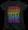 This women's Mean Girls shirt features the classic quote "She doesn't even go here!" from the 2004 comedy film. The words are set on a gradient rainbow-colored starry background. The quote is taken from a scene where a girl with a lot of feelings was giving a speech about how she would like to get along with everyone and bake a cake of rainbows and smiles. The girl was interrupted by Damian Leigh when he revealed that she didn't even go to North Shore High School.