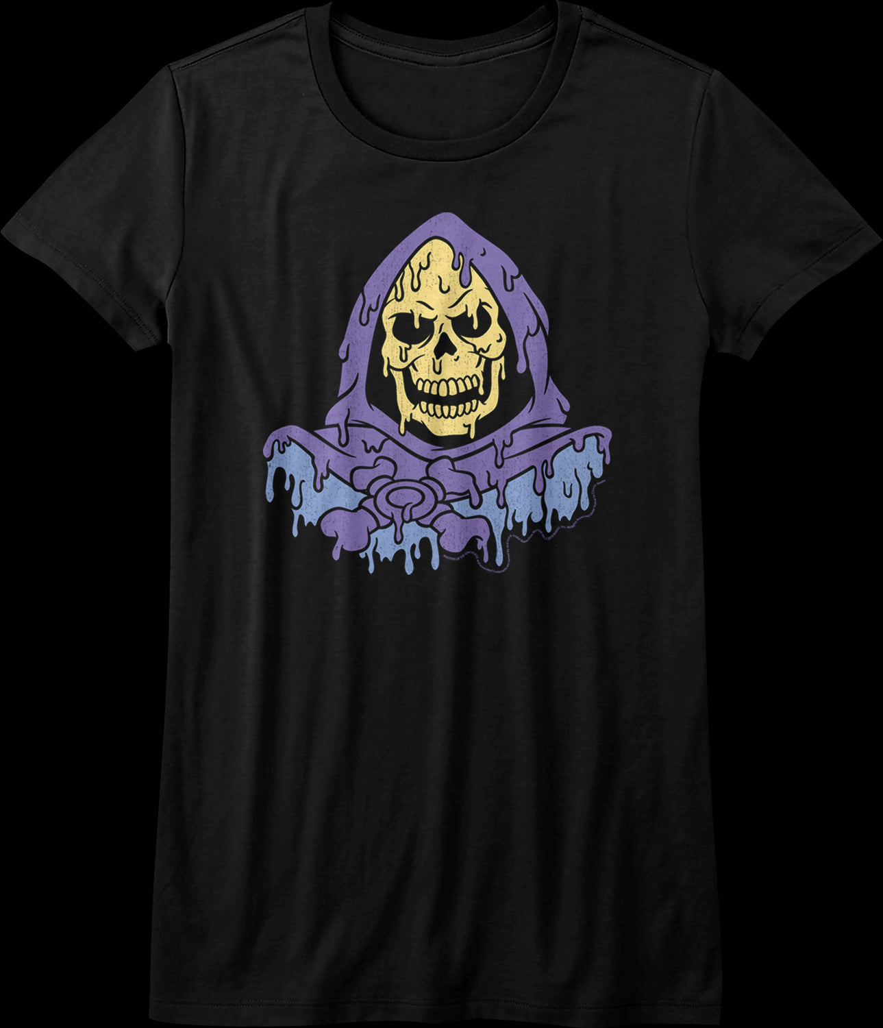 This womens Masters of the Universe shirt features an image of the "Overlord of Evil" Skeletor melting.