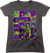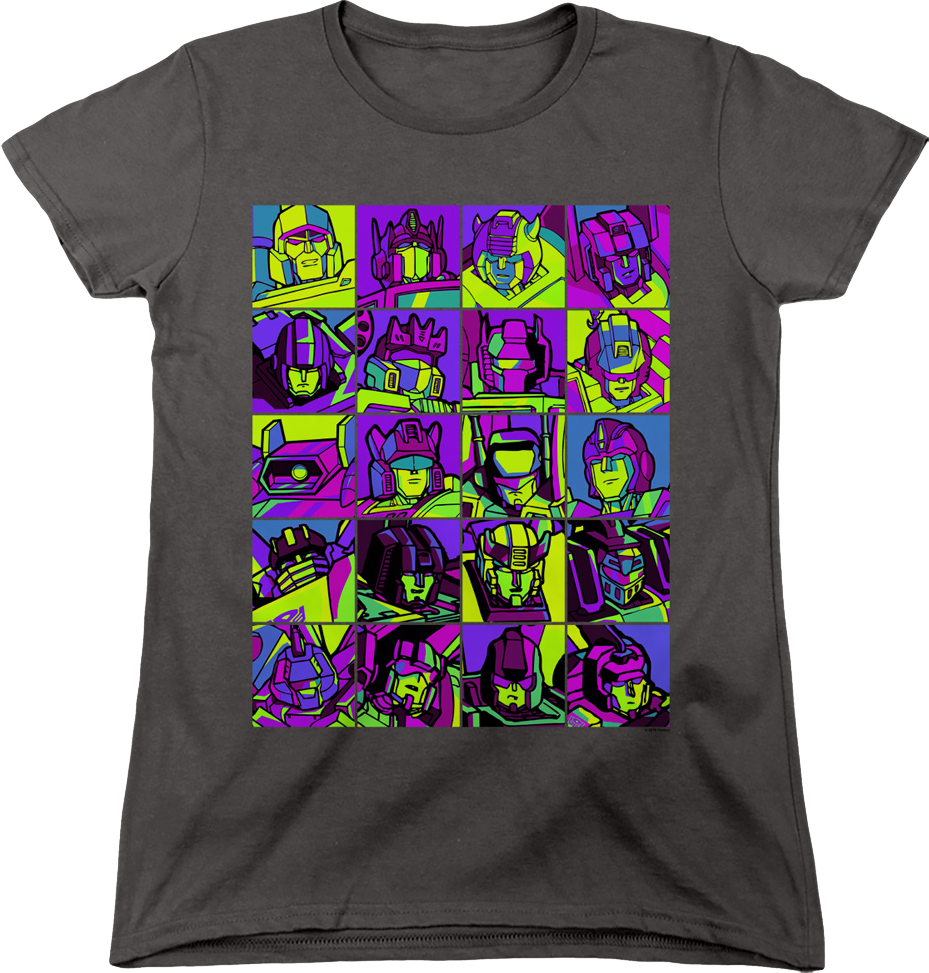 This women's Transformers t-shirt features a neon-colored collage of the most popular Autobots and Decepticons. The shirt shows Megatron, Optimus Prime, Bumblebee, Starscream, Ironhide, Soundwave, Grimlock, Ratchet, Shockwave, Jazz, Hot Rod, Thundercracker, Cliff Jumper, Devastator, Astrotrain, and more!