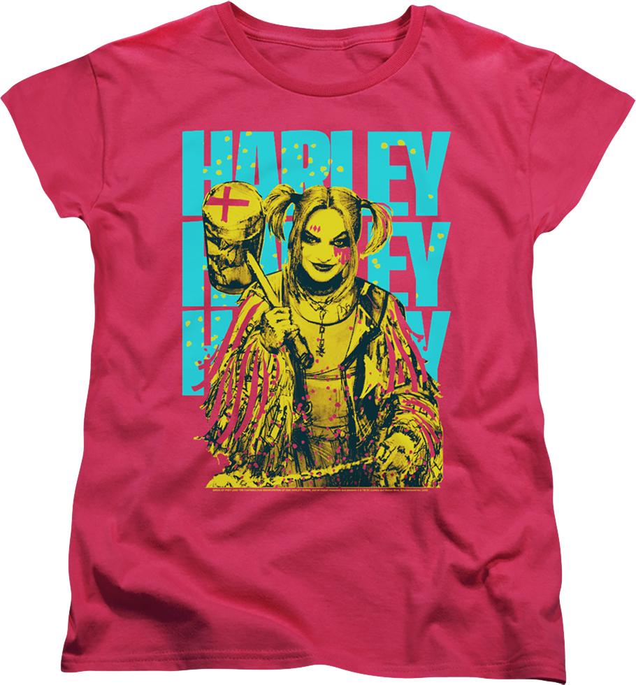 This womens Birds Of Prey shirt shows Harley Quinn posing with her trusty oversized mallet.