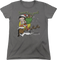 This womens Betty Boop shirt shows the animated icon taking on the role of Santa Claus, as she climbs down a chimney with a bag of presents, while her reindeer fly off in the background. The shirt reads "Someone was good!"