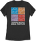 This womens Teenage Mutant Ninja Turtles shirt shows squares that feature outlines of Leonardo, Michelangelo, Donatello, and Raphael. Each square shares the color of the turtles' mask.