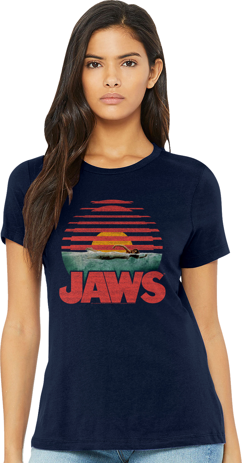 This Womens Sunset Blinds Jaws Shirt features the focal point of the Jaws movie poster. The image on this shirt shows Chrissie Watkins swimming with the sun setting behind her. We all know what's lurking just below her in the water...da-dum, da-dum. Chrissie was the first of many shark attack victims in Jaws and her chilling death set the tone for the 1975 classic.
