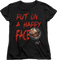 Mr. J is shown on this Womens The Joker Put On A Happy Face DC Comics Shirt applying red lipstick to his maniacal smile in a hand mirror. It reads, "Put on a happy face" in red, splattered letters. The Clown Prince of Crime's terrifying face has made him a favorite villain in the pages of DC since he first graced its pages in 1940.