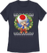 This womens Super Mario Bros. shirt features an image of the mushroom-like character Toad in a Christmas wreath that is decorated with iconic items from the Super Mario franchise.