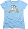This womens Betty Boop shirt shows the animated icon riding a unicorn near a rainbow.