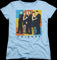 This womens Friends shirt shows Chandler Bing, Rachel Green, Phoebe Buffay, Ross Gellar, Monica Gellar and Joey Tribbiani posing in front of a colorful background.