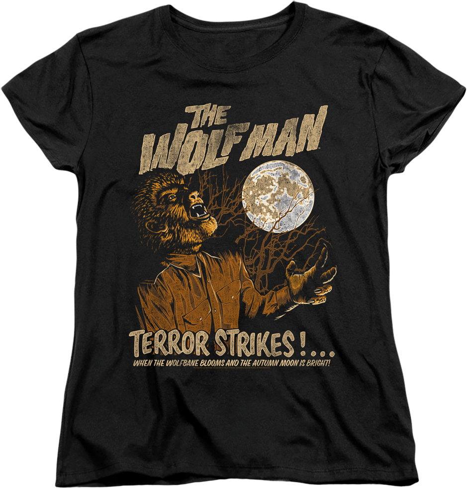The werewolf from the 1941 horror film is shown howling at the moon on this Womens Wolf Man Shirt. It reads, "Terror strikes!...when the wolfbane blooms and the autumn moon is bright." Lon Chaney Jr.'s portrayal of the monster influenced the depiction of werewolves in movies ever since.