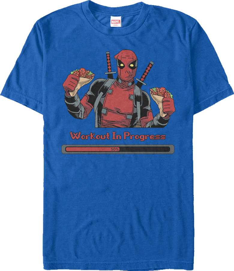 Deadpool is seen on this shirt, just as in many Marvel comics, with two swords strapped to his back. He is holding 2 tacos in his hands above a meter showing his workout progress. Who wouldn't love to curl tacos instead of weights?