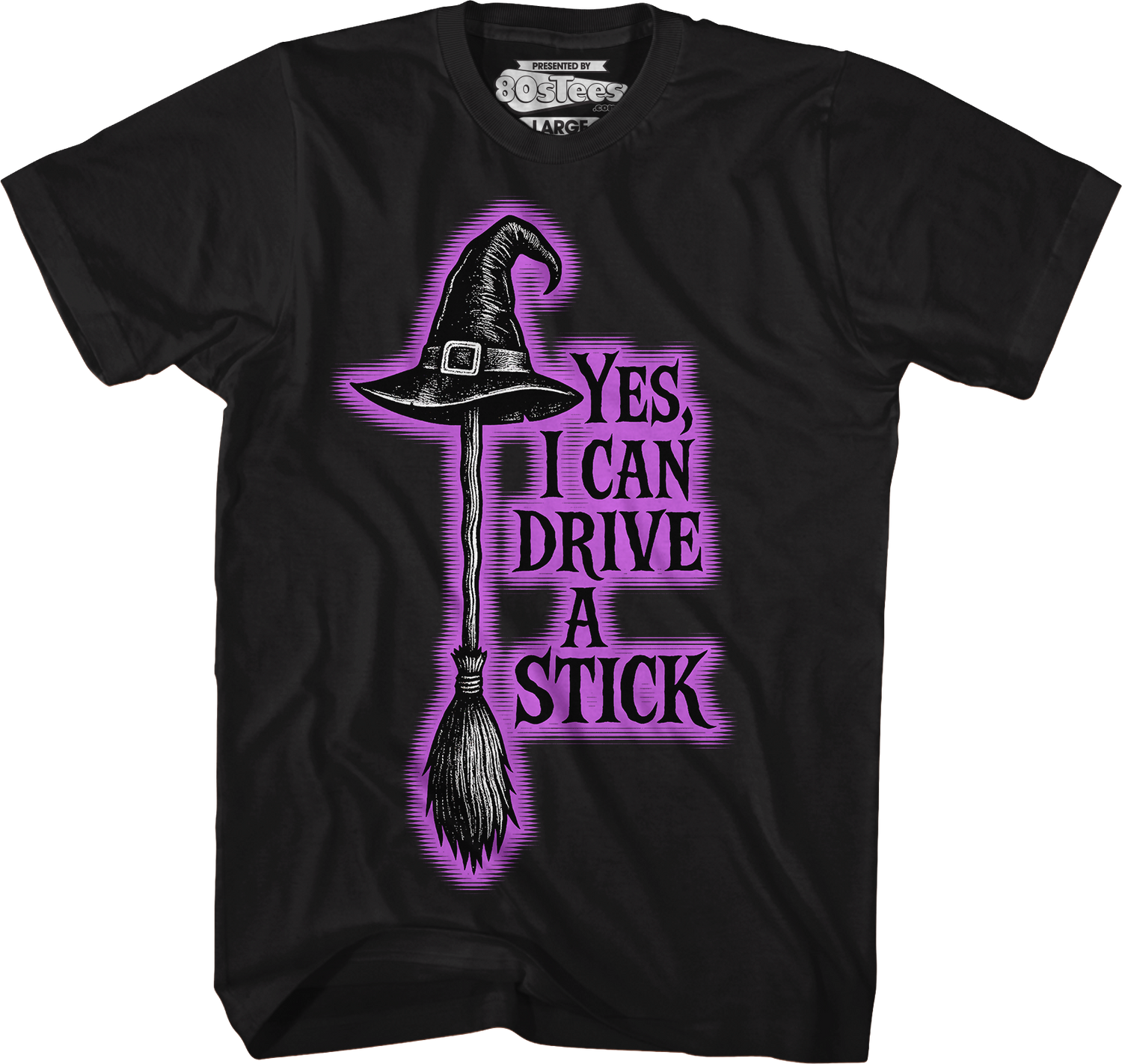 This 80sTees.com exclusive t-shirt shows a witch's hat resting on top of a broomstick. The shirt reads Yes, I Can Drive A Stick.
