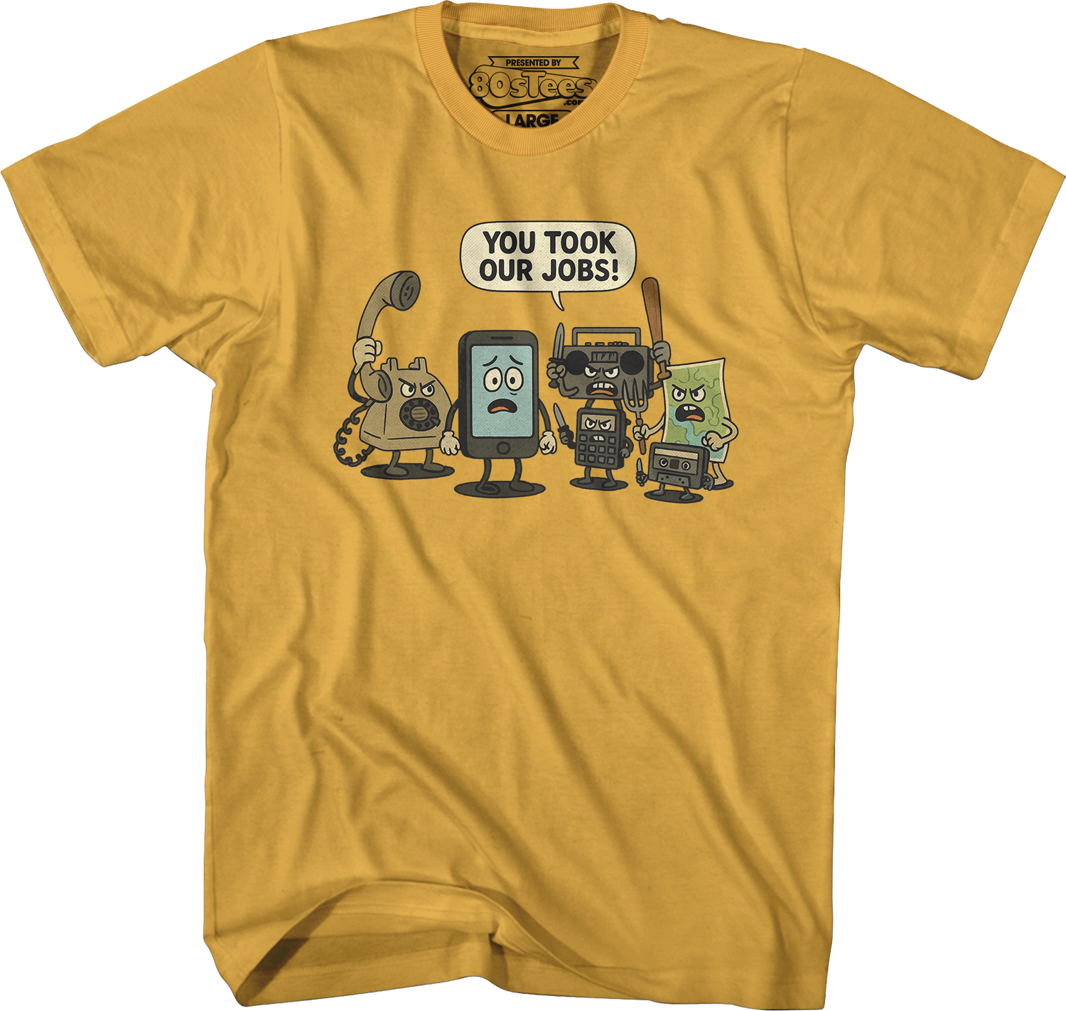 This 80sTees.com exclusive t-shirt shows a rotary phone, a stereo, a calculator, a map, and a cassette tape threatening a smartphone with weapons and saying, "You took our jobs!"