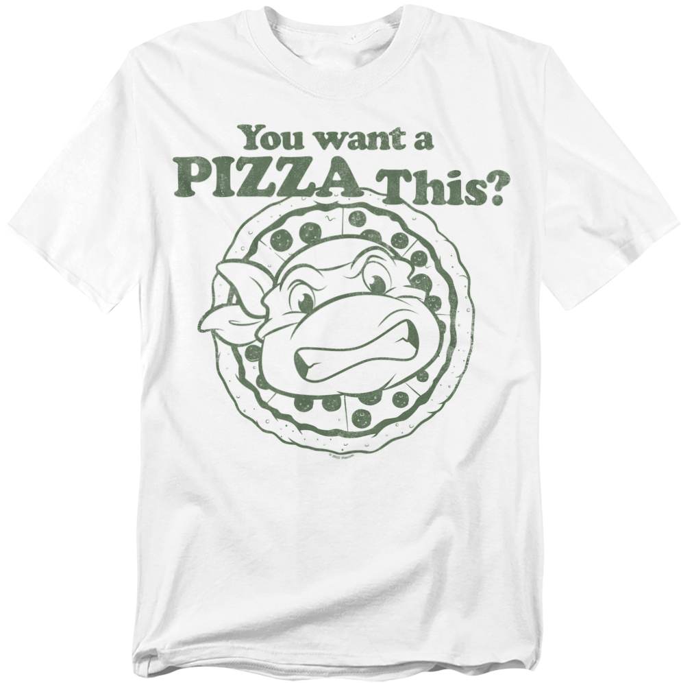 This Teenage Mutant Ninja Turtles t-shirt shows a sketch of a Ninja Turtle on a pepperoni pizza. The shirt reads "You want a PIZZA This?"