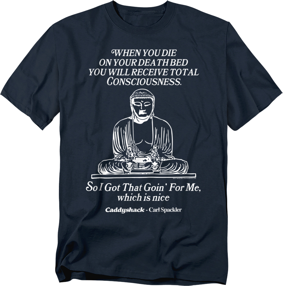 This Caddyshack t-shirt features a Buddha statue. The shirt reads "When You Die On Your Deathbed You Will Receive Total Consciousness. So I Got That Goin' For Me, which is nice."