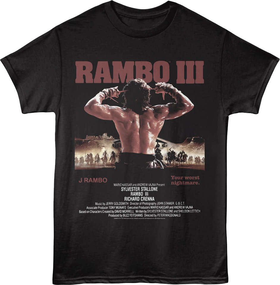 This Rambo t-shirt features a poster for the 1988 blockbuster Rambo III. The poster includes the iconic quote "Your worst nightmare."