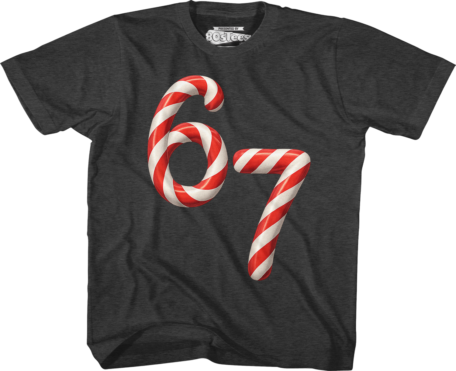 This 80sTees.com exclusive youth shirt shows peppermint candy canes in the shape of the numbers 67.