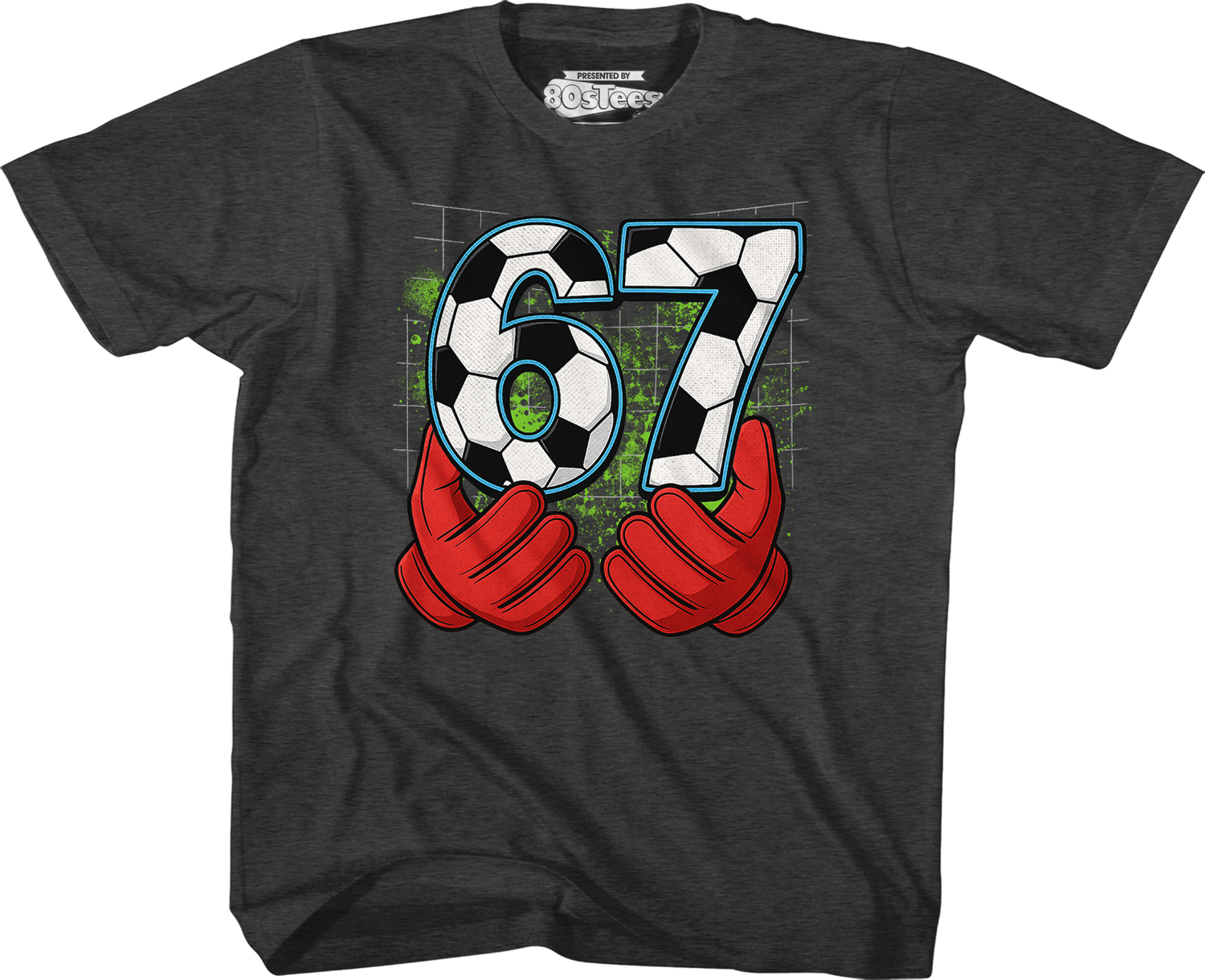 This 80sTees.com exclusive youth shirt shows a goalkeeper's gloves holding soccer balls that are shaped like the number 67.