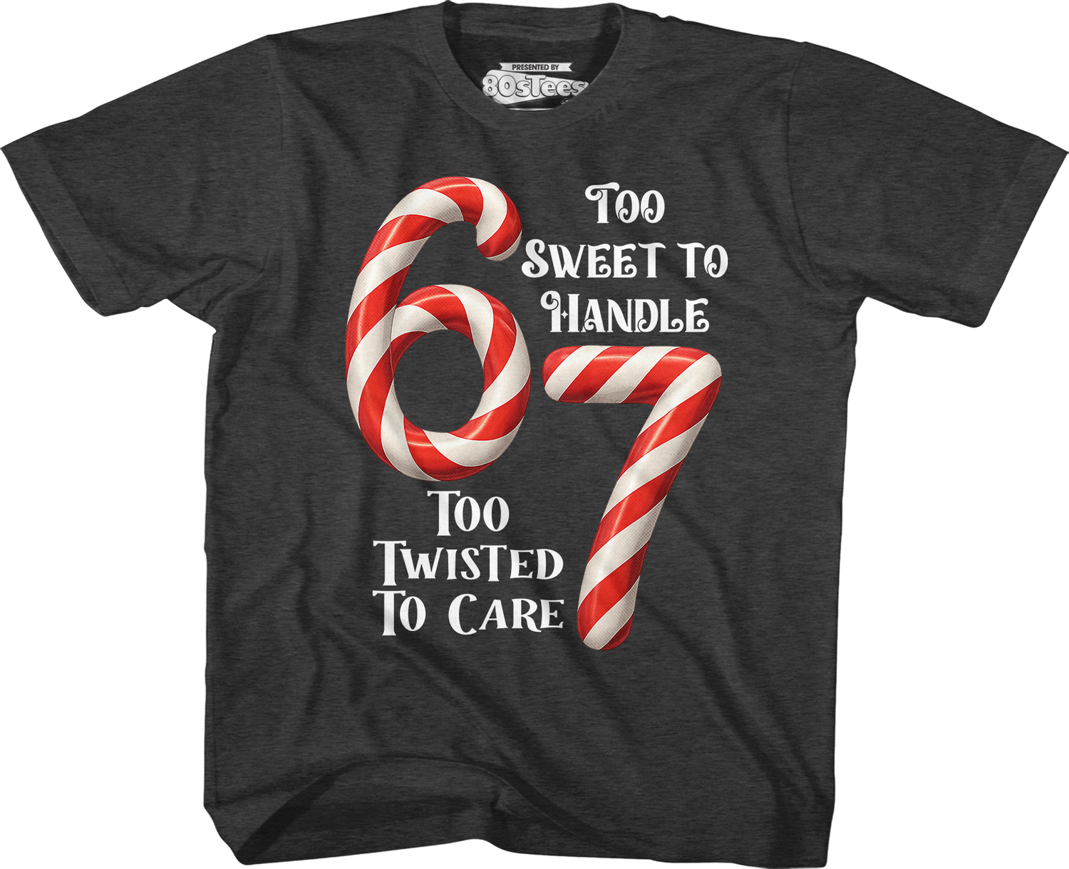 This 80sTees.com exclusive youth shirt shows candy canes shaped like the numbers 67. The shirt reads Too Sweet To Handle Too Twisted To Care.