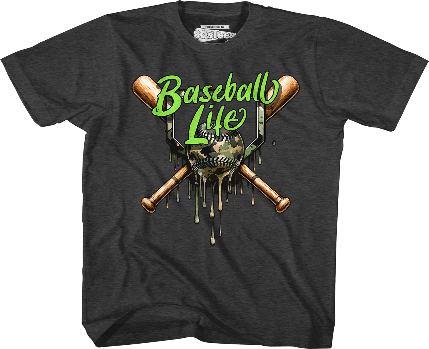 This 80sTees.com exclusive youth shirt shows crossed baseball bats and camouflage paint dripping from a baseball and a home plate. The shirt reads "Baseball Life".