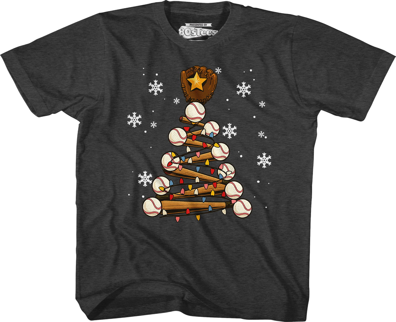 This 80sTees.com exclusive youth shirt shows snowflakes surrounded a Christmas tree made with baseballs, baseball bats, a baseball glove and Christmas lights.