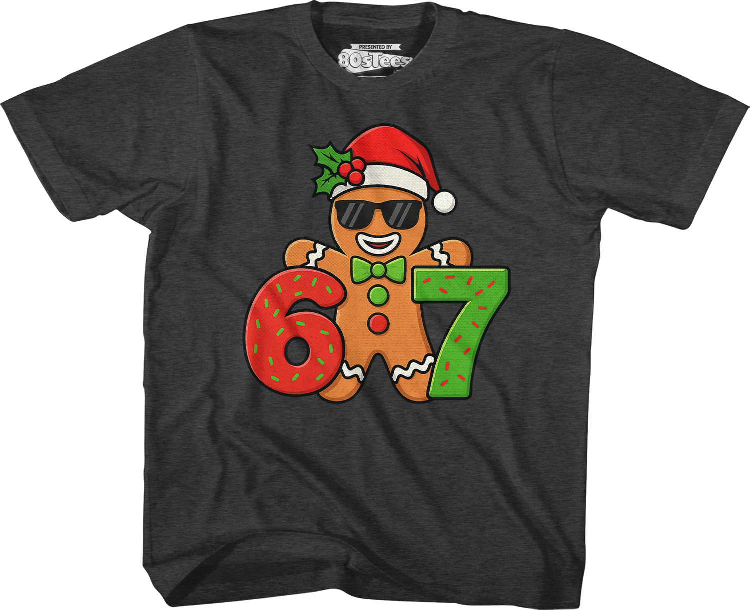 This 80sTees.com exclusive youth shirt shows a gingerbread man cookie wearing a Santa Claus hat and sunglasses, and posing with decorated 67 cookies.