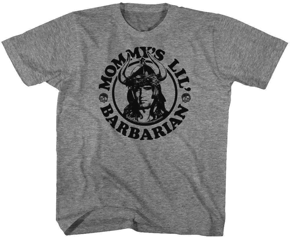 This Youth Mommy's Conan The Barbarian Shirt shows Arnold Schwarzenegger's character from the 1982 movie wearing his horned helmet. The shirt reads "Mommy's lil' Barbarian" with skulls. Your little one needs this shirt for the days that you feel like your house has been pillaged and plundered.