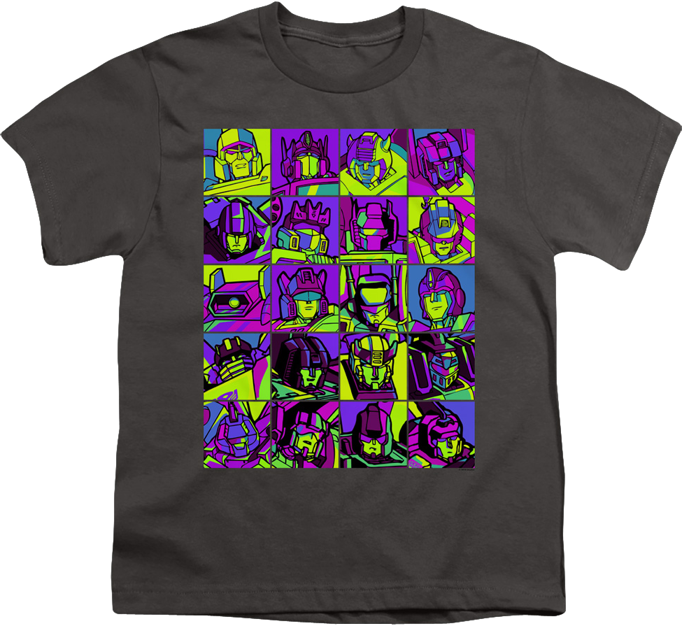 For any kid who is a fan of the robots in disguise, this Youth Neon Pop Art Robot Collage Transformers T-Shirt is a must have!