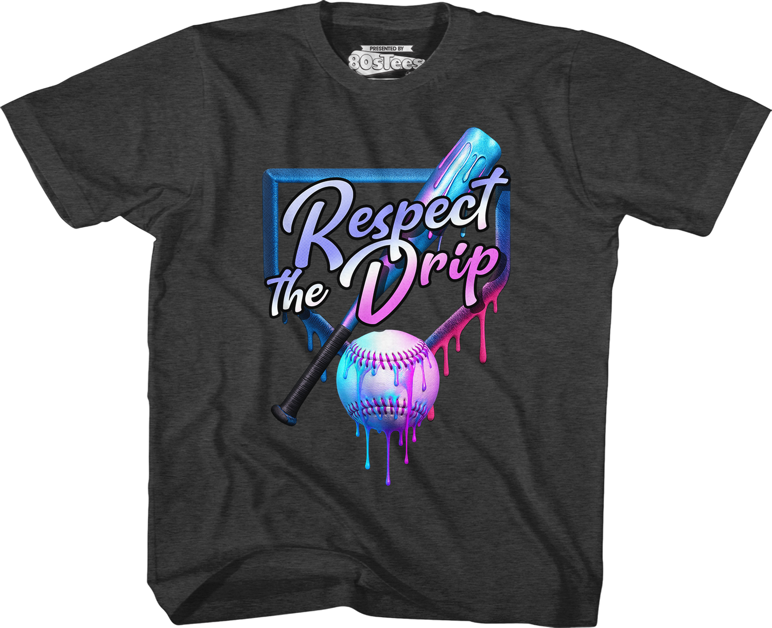This 80sTees.com exclusive youth shirt shows a baseball, bat, and home plate dripping with colorful paint. The shirt reads "Respect the Drip".
