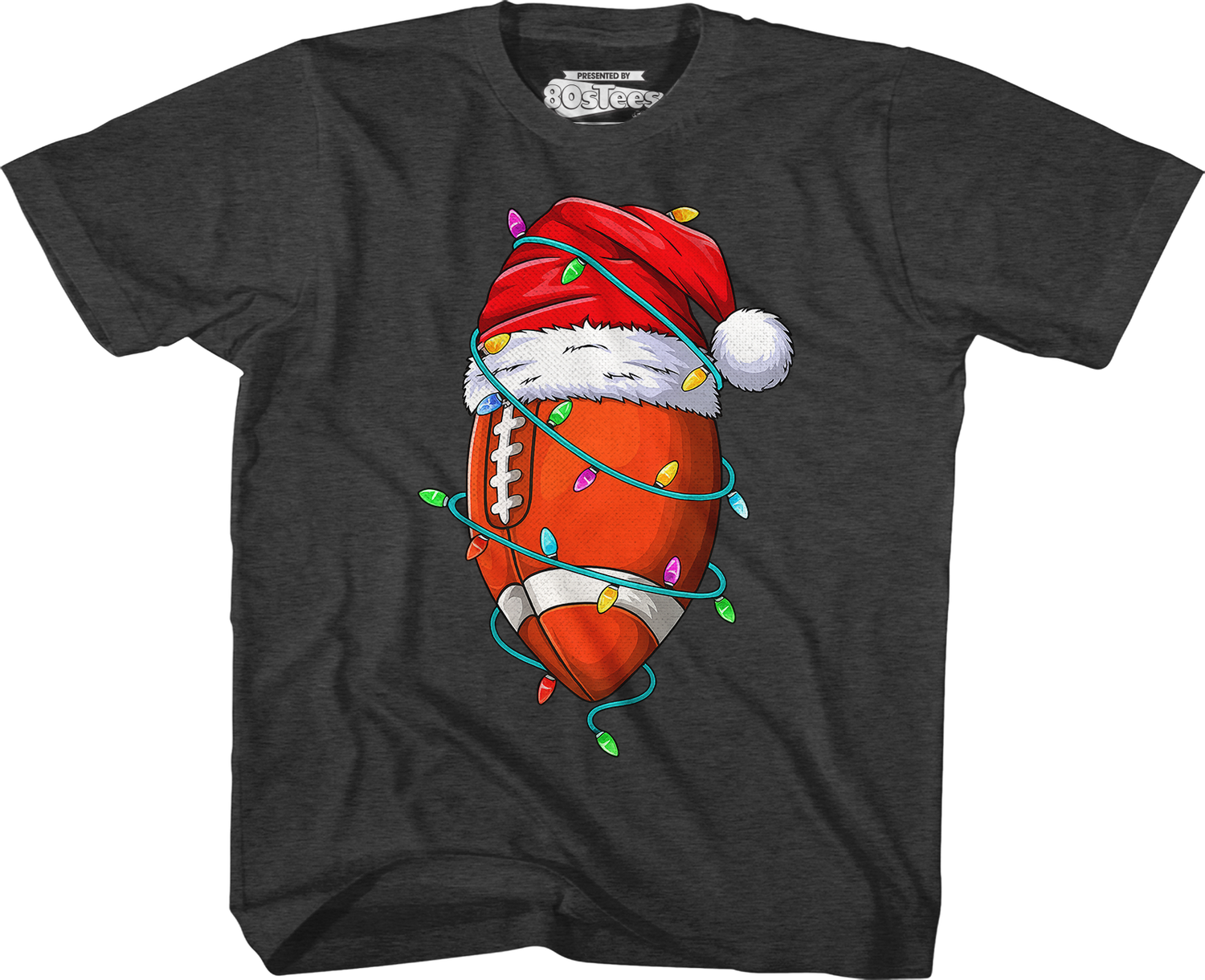 This 80sTees.com exclusive youth shirt shows a football decorated with a Santa Claus hat and Christmas lights.