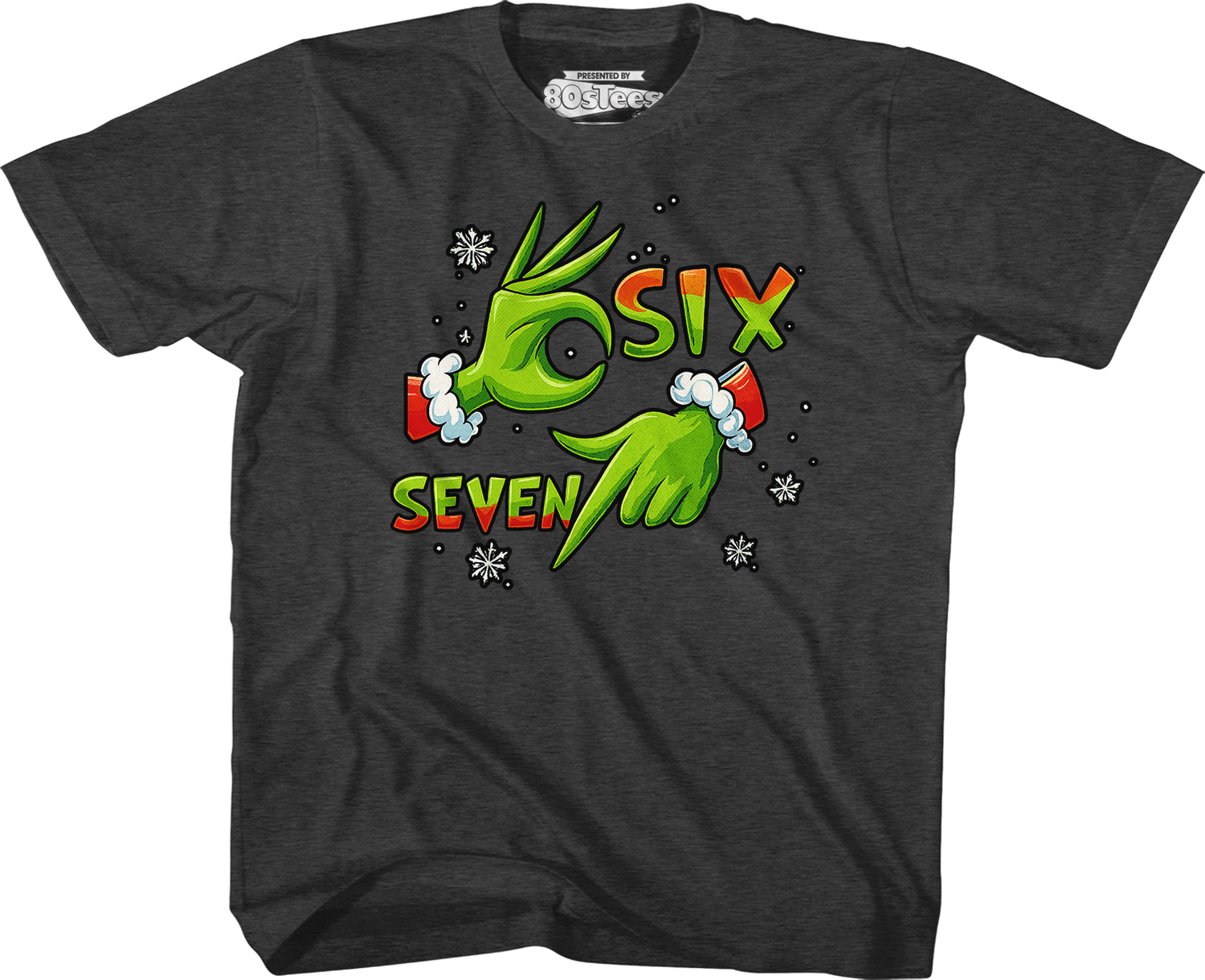 This 80sTees.com exclusive youth shirt shows snowflakes surrounding the Grinch's hands as his fingers make the shapes of the numbers 6 and 7.