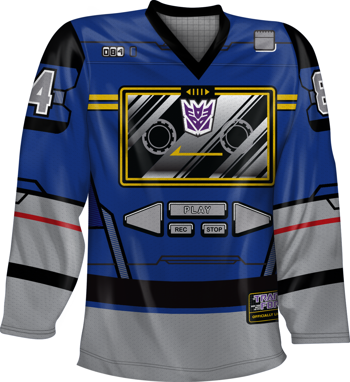 The back of the jersey shows a small Decepticons logo above the name Soundwave. The jersey is given the number 84 because 1984 is the year that Soundwave first appeared on the Transformers animated series. The front of the jersey includes a Transformers logo patch that looks like it has been sewn on to complete the look of an authentic hockey jersey!