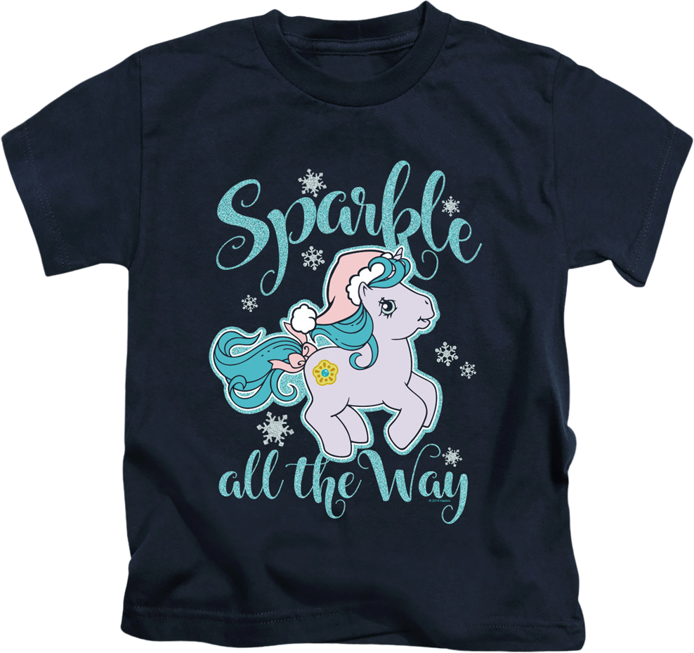 Princess Sparkle is instantly recognizable with her gold flower-shaped medallion with a green jewel. Everyone will know your child is a fan when they wear this Youth Sparkle All The Way My Little Pony T-Shirt!