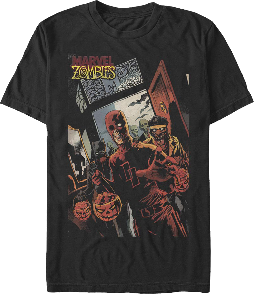 This Marvel Comics t-shirt features the cover artwork for Marvel Zombies Halloween Vol. 1 #1. The artwork, designed by Francesco Francavilla, shows zombie versions of Black Panther, Daredevil, and Luke Cage with Jack o'Lantern Trick or Treat baskets.